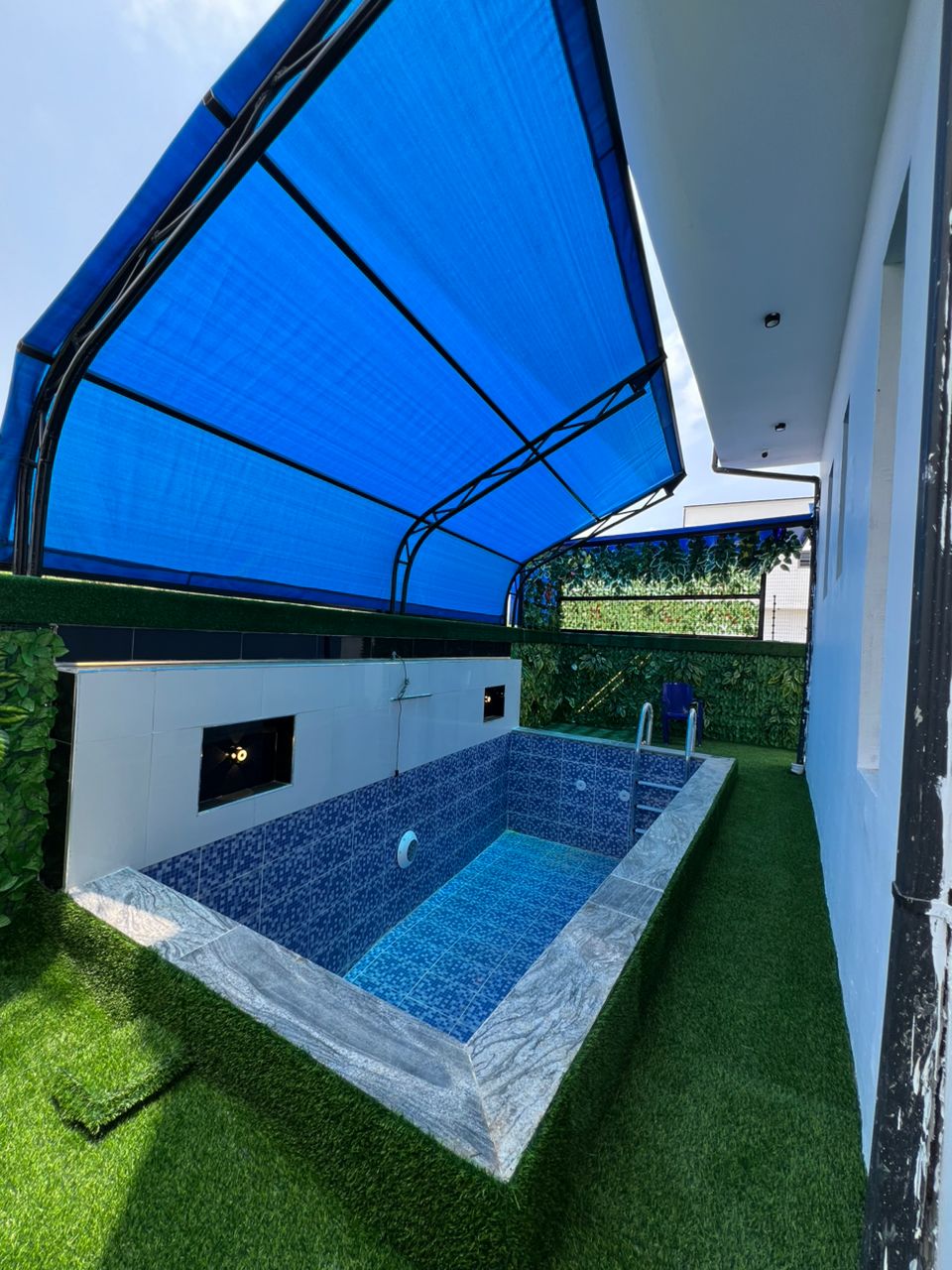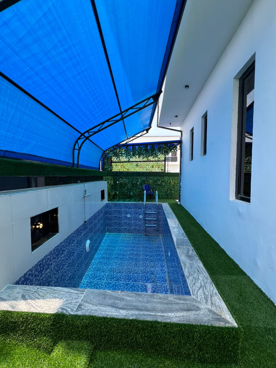 Step out to a tranquil swimming pool, perfect for cooling off or lounging in style.